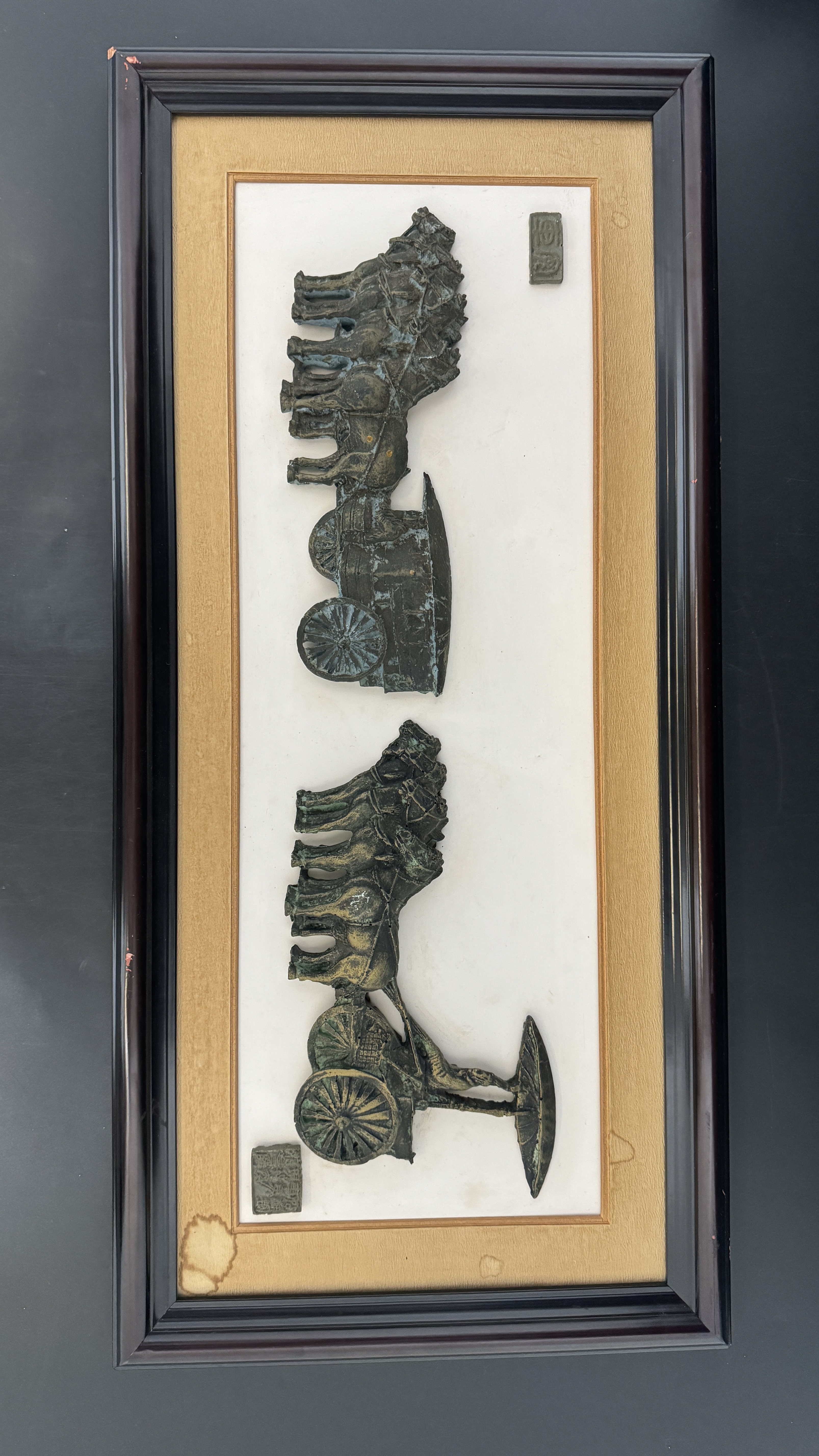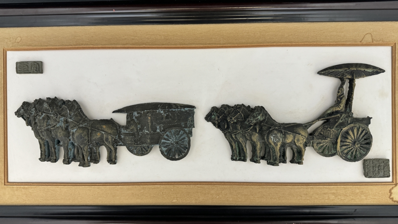 它以青銅為材質(zhì),整體呈現(xiàn)出古樸的銅銹色澤,還原了古代銅車馬的質(zhì)感。擺件由兩輛銅車和多匹銅馬組成,左側(cè)車馬為密閉車廂式,馬匹排列整齊,肌肉線條刻畫有力,車廂細節(jié)雖經(jīng)簡化但仍具古韻;右側(cè)車馬帶有傘蓋,馭手形象生動,馬匹姿態(tài)矯健,車輪紋飾清晰,盡顯古代車馬的形制特征。擺件被裝裱于木質(zhì)畫框中,框內(nèi)襯以淺色背景,既便于展示,又突出了銅車馬的藝術(shù)細節(jié),整體布局協(xié)調(diào),具有較強的觀賞性。
